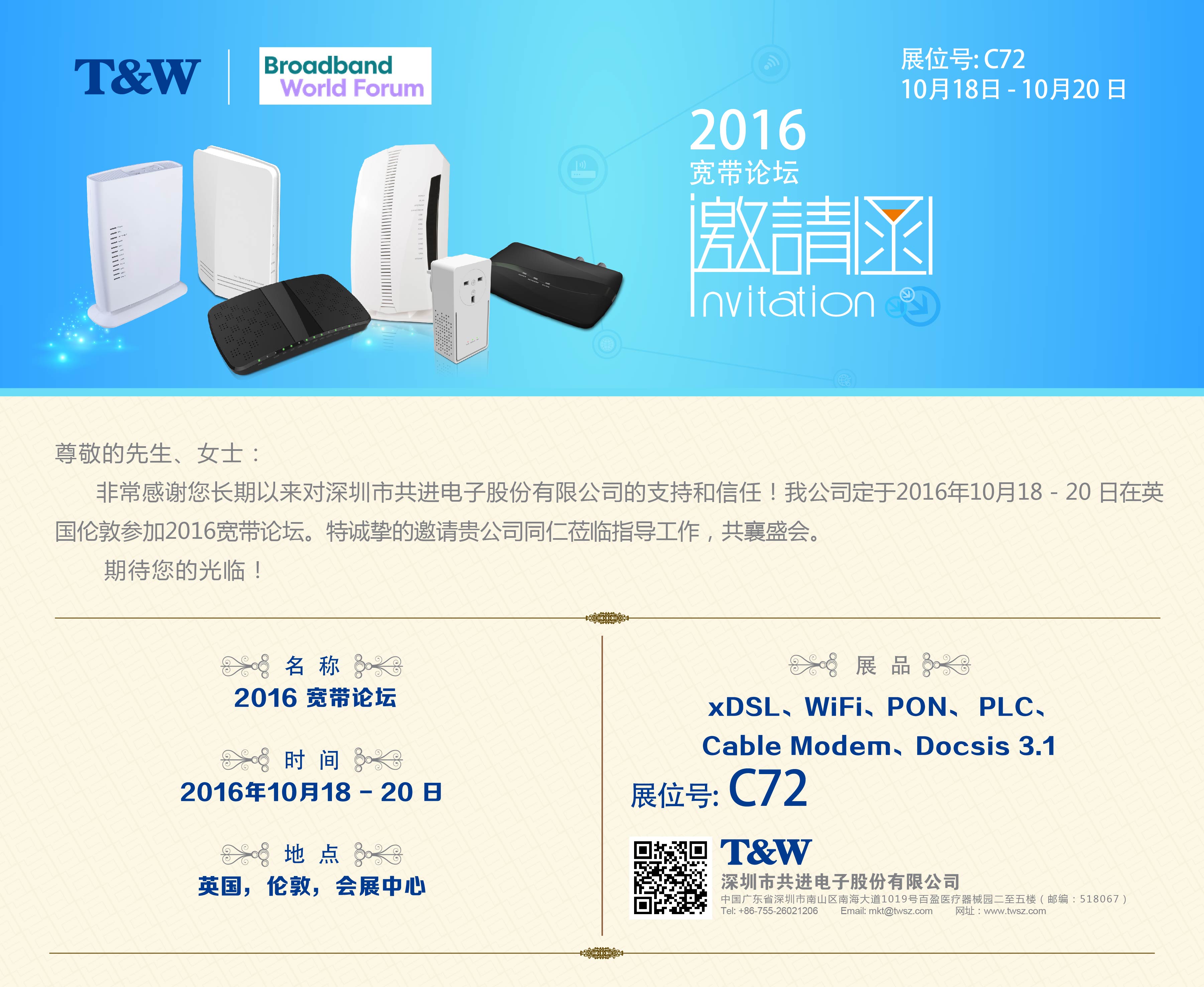 1.展会信息: 展 会 名:2016 宽带论坛 展 期:2016年10月18 - 20 日 国家地区:英国,伦敦 展 馆:会展中心 摊 位 号:C72 2.邀请函下载 3.展馆平面图: